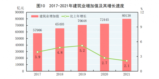 中华建设网讯 2月28日上午,国家统计局发布2021年国民经济和社会发展统计公报。初步核算,全年国内生产总值1143670亿元,比上年增长8.1%,两年平均增长5.1%。其中,全年建筑业增加值80138亿元,比上年增长2.1%。 建筑业增加值80138亿元,比上年增长2.1% 全年建筑业增加值80138亿元,比上年增长2.1%。全国具有资质等...