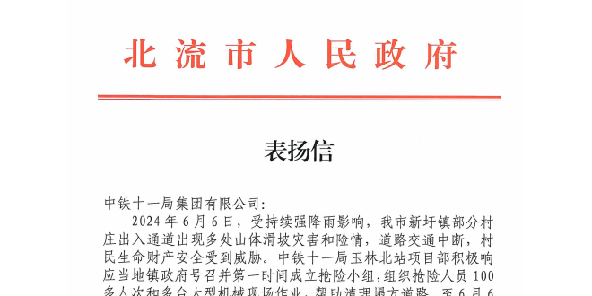 中华建设网讯(通讯员 李佳淼 何铭超) 6月18日,中铁十一局玉林北站项目部收到北流市人民政府的一封表扬信。信中对中铁十一局玉林北站项目在北流市新圩镇部分村庄的山洪泥石流灾害救援中,表现出的过硬专业能力和央企责任担当提出表扬。 在接到属地政府发出的紧急抢险救援指令后,玉林北站项目部积极响应当地...