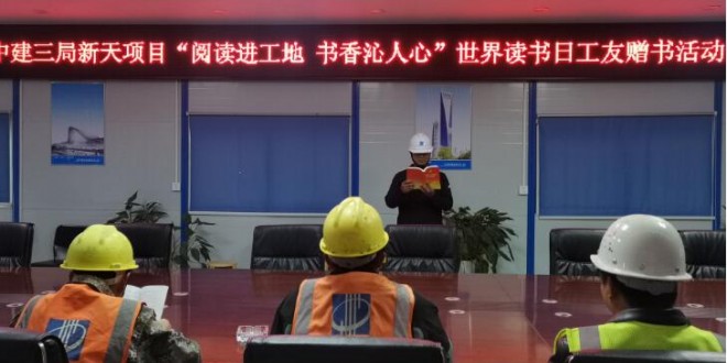 中华建设网讯(通讯员 孙奥)读万卷书,行万里路。4月23日,在第28个“世界读书日”当天,中建三局新天项目开展“阅读进工地 书香沁人心”世界读书日工友赠书活动,借此丰富工友们的文化生活,激发工友们的读书热情,营造学习氛围,让书香充满项目。 活动现场,项目管理人员与一线工友齐聚会议室,项目党支部书记潘...
