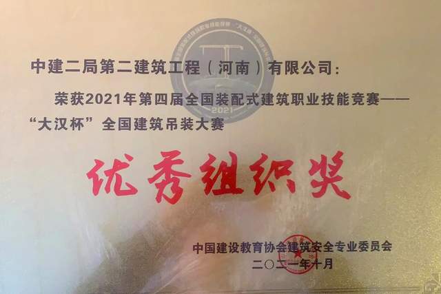 (本刊讯)近日,从中国建设教育协会建筑安全专业委员会获悉,中建二局第二建筑(河南)有限公司在2021年第四届全国装配式建筑职业技能竞赛——“大汉杯”全国建筑吊装大赛中荣获优秀组织奖。