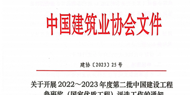 中华建设网讯 (记者张颖) 据中国建筑业协会官微消息,近日,中国建筑业协会发布通知,决定开展2022~2023年度第二批中国建设工程鲁班奖(国家优质工程)评选工作。被推荐的工程应于2020年1月1日~2022年6月30日期间交工投入使用或完成验收备案(房屋建筑和市政园林工程)或综合验收(工业交通水利工程),验收备...