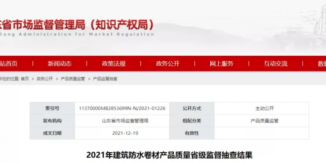 12月19日,山东省市场监督管理局网站公布了2021年建筑防水卷材产品质量省级监督抽查结果。 本次共抽查生产领域建筑防水卷材产品125批次,其中利民防水、鲁泰防水、锦兴防水、东凤防水、金宝防水、思云防水、晨光防水、明泽防水、卓诺防水、金佰利防水、凯源防水、智源防水12家企业生产的12批次产品抽查结果不...