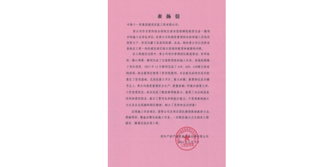 中华建设网讯(通讯员 贾昊 何铭超)近日,中铁十一局建安公司多个项目先后获来信表扬。信中,对公司所属项目在施工进度、质量、安全、环保等方面的优异表现给予充分肯定和表扬,对公司及项目管理团队的付出和努力表示感谢。 公司光谷南大健康产业园项目获江夏区郑店街道感谢信,郑店街道对项目部在建设中面对施工现...