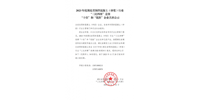 湖北省各预拌混凝土(砂浆)企业,各地市州预拌混凝土(砂浆)行业主管部门和行业社会组织: 经企业申报、计分汇总和证求所在市州行业主管部门意见,2023 年度湖北省预拌混凝土(砂浆)行业“三比四赛”竞赛“十佳”和“优胜”企业名单已经产生。按照湖北省建设科技与建筑节能办公室、湖北省建设工会工作委员会和湖北省...