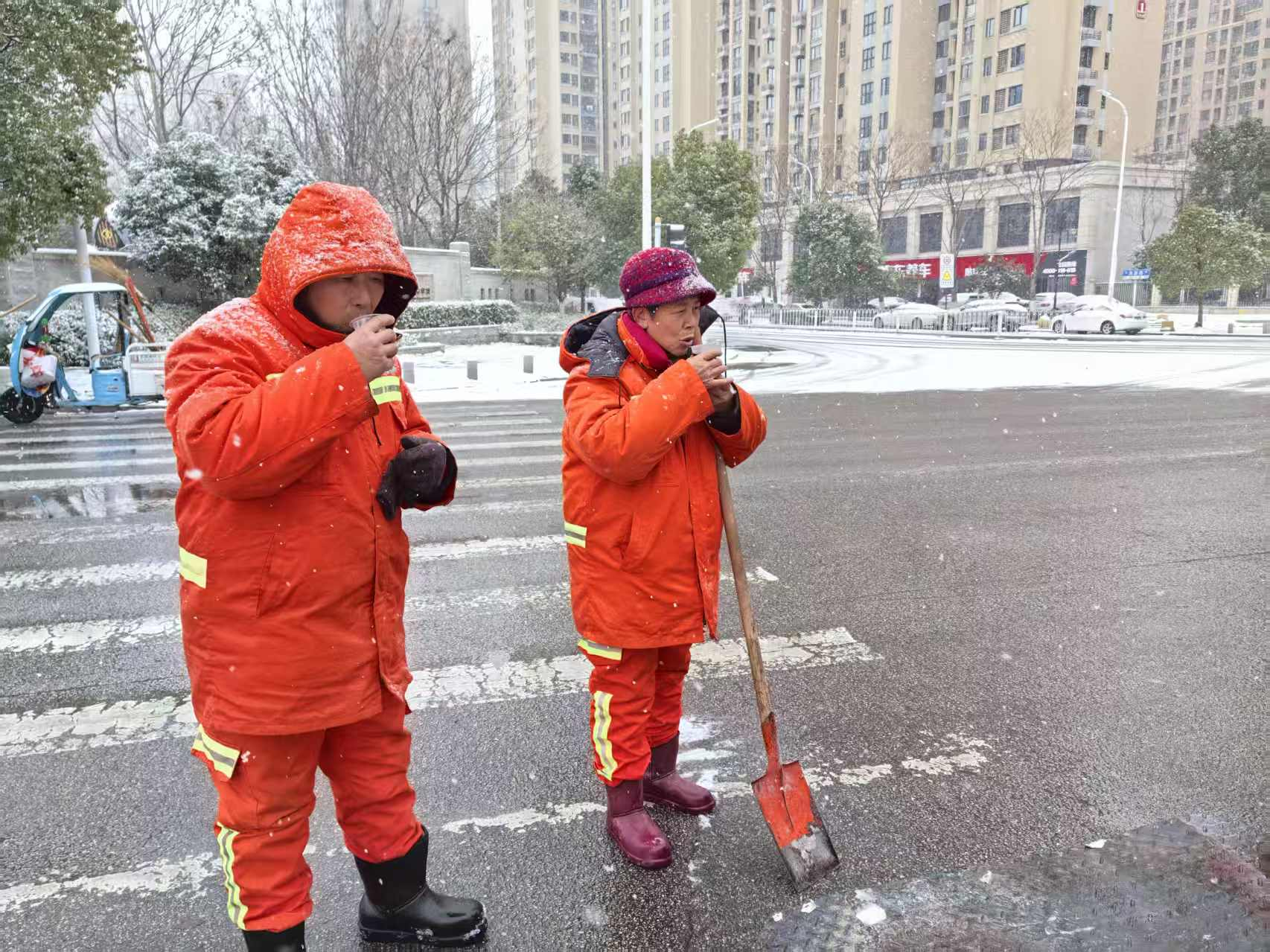 中华建设网讯(通讯员 刘楚倩 )1月20日,武汉普降大雪。全市环卫工人坚守一线,全力保障道路畅通与市民出行安全。将军路市政环卫公司工会同步启动专项慰问,将温暖直接送到各个除雪作业现场。 上午10时,在碧水大道除冰点,工会工作人员将刚煮好的姜丝可乐递到环卫工人手中。天气冷,辛苦了,趁热喝。正在凿冰清淤的周师...