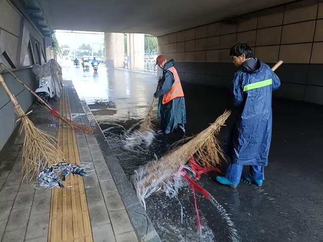 管城区组织环卫人员全力清排道路积水,对城东路下穿隧道东侧辅道污泥进行清理,保障居民出行安全。