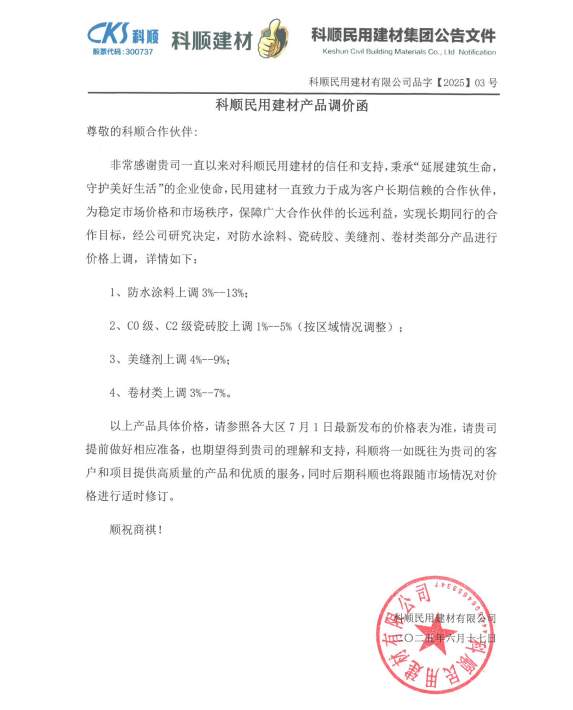 核心摘要:日前,科顺民用建材集团发布产品调价函。宣布自2025年7月1日起对防水涂料、瓷砖胶、美缝剂、卷材类部分产品实施价格上调。