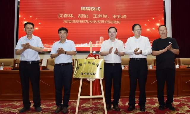 沈春林、胡俊、王养岭、王兆峰为项城培栋防水技术研究院揭牌。