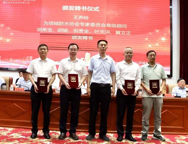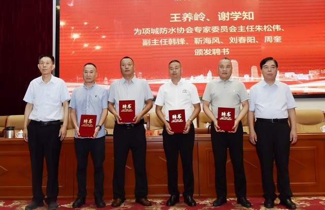 王养岭等领导为项城防水协会专家委员会主任朱松伟、副主任韩锋、靳海风、刘春阳、周奎颁发聘书。