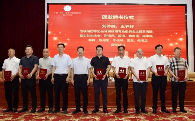 刘体峰、王养岭为项城防水协会堵漏修缮专业委员会主任王清远、副主任李志全、靳海风、周洁、魏富伟、陈幸福、韩锋、陈向阳、于俊峰、王奎、侯泽龙颁发聘书。