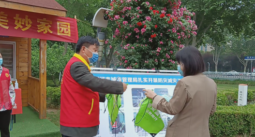 徐楚(中)给市民发放防灾减灾宣传品