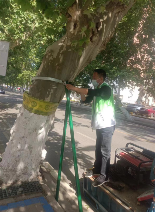 园林职工正在为树木设立支撑进行加固