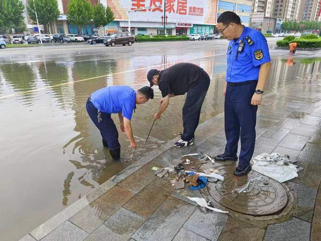 他们分工明确,配合默契,有的负责用扫帚将积水扫向排水口,有的则用铲子清理排水口周边的杂物,防止堵塞,确保排水顺畅。为提高清理效率还调配了多辆洗扫车、洒水车等车辆参与作业,迅速将路面积水和垃圾进行清理,有效减少了人工清理的工作量,洒水车则利用高压喷头,对路面进行冲洗,将残留的泥沙和杂物冲到路边,便于后续清扫。